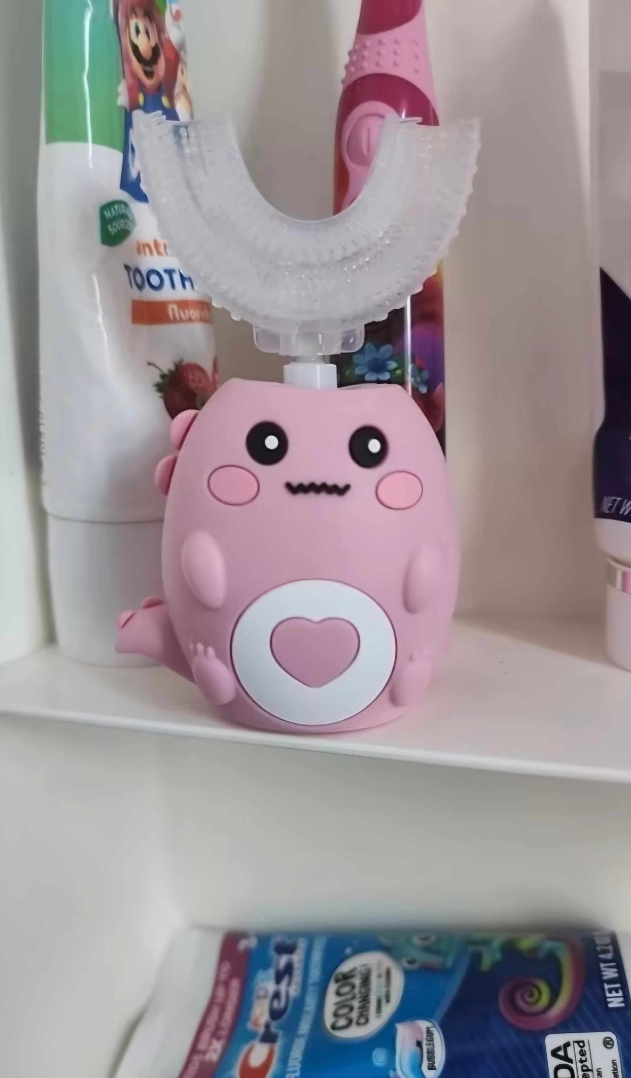 It’s designed for kids aged 2 to 12 years old, with a soft silicone brush head that’s safe and gentle for little mouths.